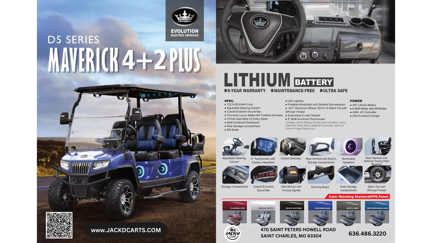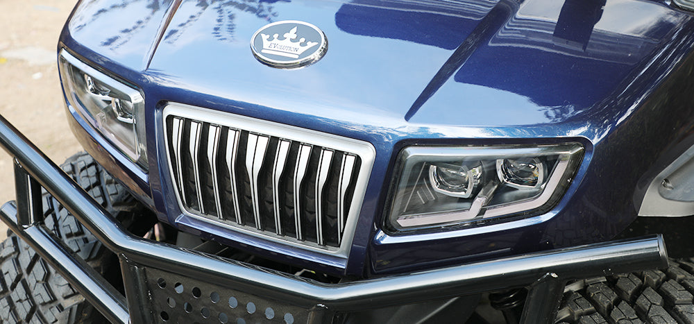 FeaturesRear View Mirrors with Turn Signal Light Indicators, Foldable Windshield with Slidable Air Vents, 9-Inch Multi-Functional Touchscreen, Multi-Functional Dashboard Automotive-Style Steering Wheel, Adjustable Steering Wheel, with Tilting Angle Luxury Seats, with Foldable Armrests, 3-Point Seat Belts for Each Seat, Rear Seat Cup Holders, USB Ports, Storage Pocket Lithium Battery, 25A On-Board Fast Charger, Golf Bag Holder, Dock Top Mount Sound Bar, Rear Storage, Trunk Automotive-Style Rear Bumper, Brush Guard for Off-Road Models, Front/Rear Fender Flares, LED Lights, Automotive E-Coat Chassis, Backup Camera, Running Board.