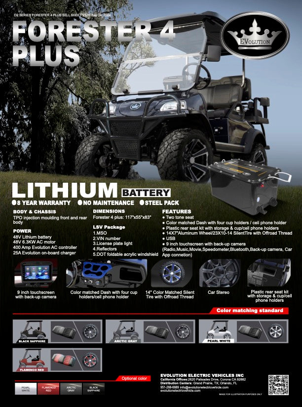 Features●9-inch touchscreen with Speedometer display ,back-up camera ,Stereo system ,Bluetooth connection …… ●Luxury 2 Tone Seats* ●Decorative Strip ●Colored Decorative Wheel Trim ● Dashboard with color-matching cupholder insert ● Luxury Steering Wheel ● Extended roof and flip flop rear seat kits ● Plastic rear seat kit with trunk & cup holders ● Rearview Mirror ● Horn ● USB Charging Ports ● Acid Dipped, Powder Coated Steel Chassis(Hot-Galvanized chassis optional) for a longer “cart life expectancy” with a LIFETIME Warranty! ● 25A Onboard waterproof Evolution charger, preprogrammed to Evolution lithium batteries! ● Clear foldable windshield ● Optional Golf bag holder kits ● Impact-resistant injection mold bodies ● Independent suspension with four arms ● Assembled at one of our 2 – locations in the USA for proper quality control. ● Bright lighting for the front and rear in order to maximize visibility in the dark and to alert other drivers on the road to be aware of your presence