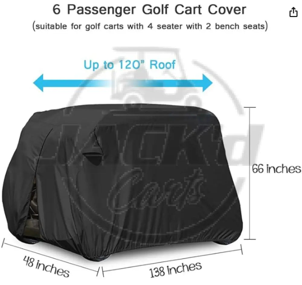 - Moveland Protective Cover: Size: 138" L x 48" W x 66" H(Roof: 120"). Compatible with EZGO, Club Car, Yamaha, and most golf carts with 6 seats Limo or 4 seaters with 2 bench seats