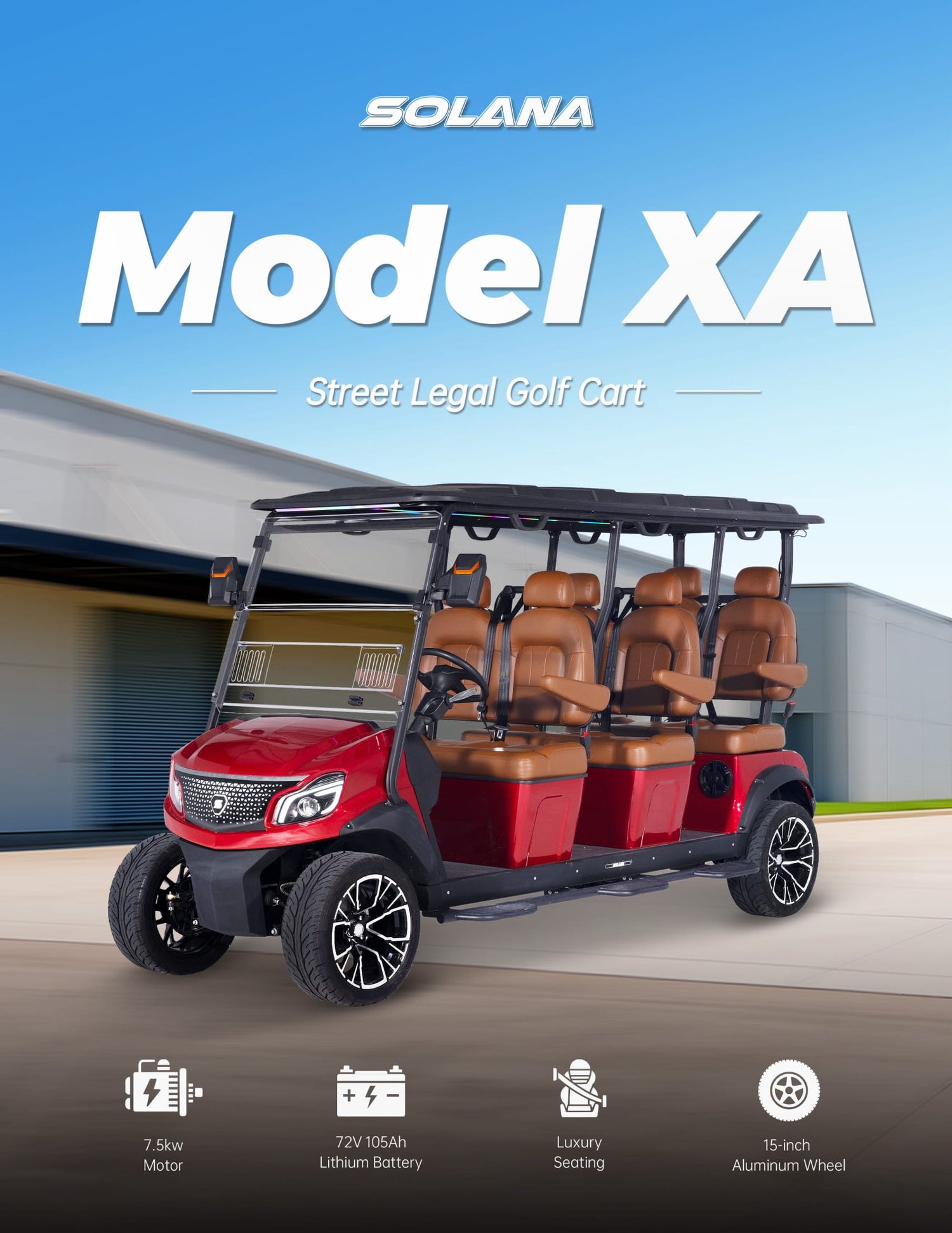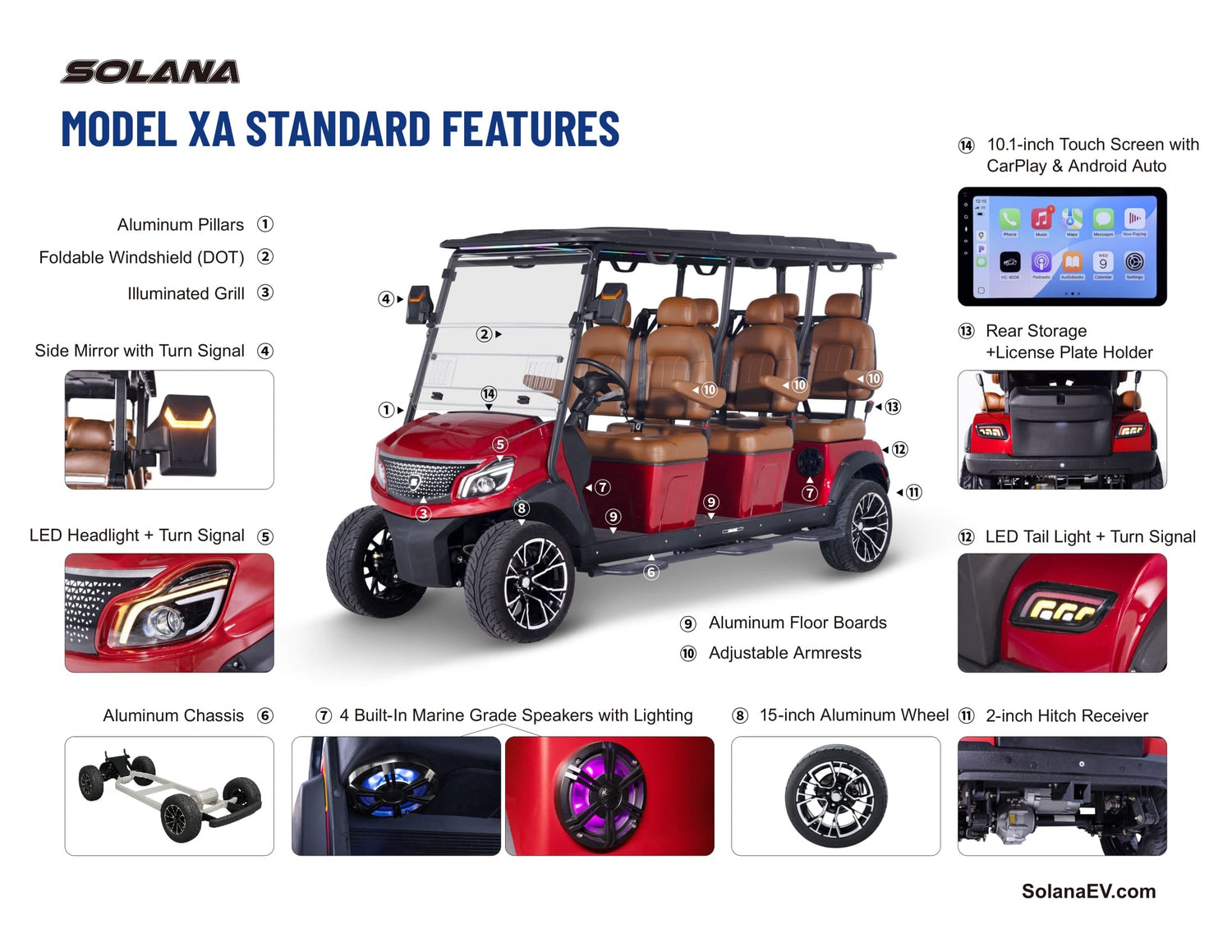 Innovation meets elegance. Whether you’re cruising the neighborhood or heading to the clubhouse, the Solana XA 6P offers a smooth, whisper-quiet, and eco-conscious ride. Built with a lightweight all-aluminum foundation and packed with modern tech like Apple CarPlay, this isn't just a golf cart—it’s a lifestyle upgrade.