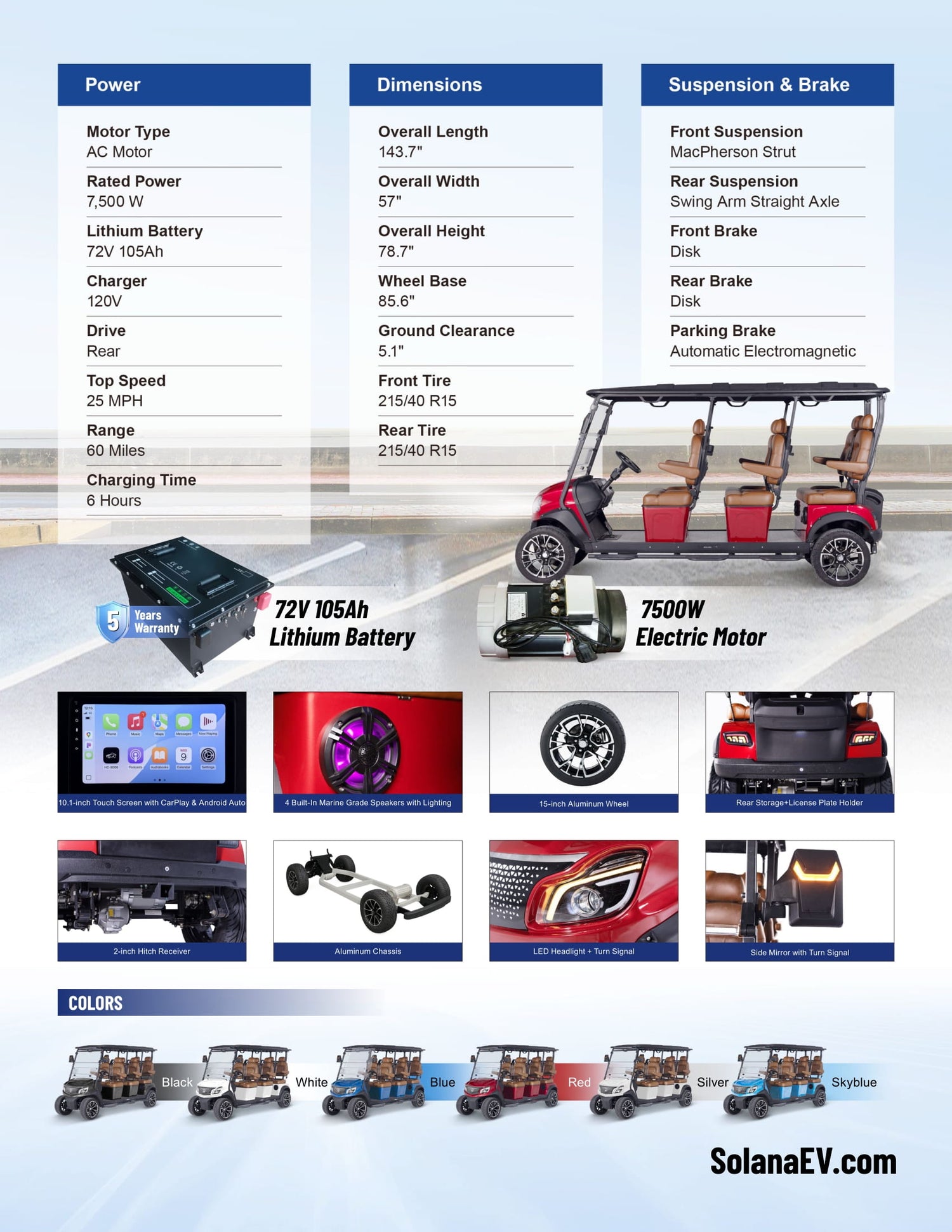 The Solana XA 6P is engineered for those who demand more. The 7,500-watt AC motor provides instant torque and smooth acceleration, while the 72V 105Ah Lithium Iron Phosphate battery ensures you spend more time driving and less time charging.